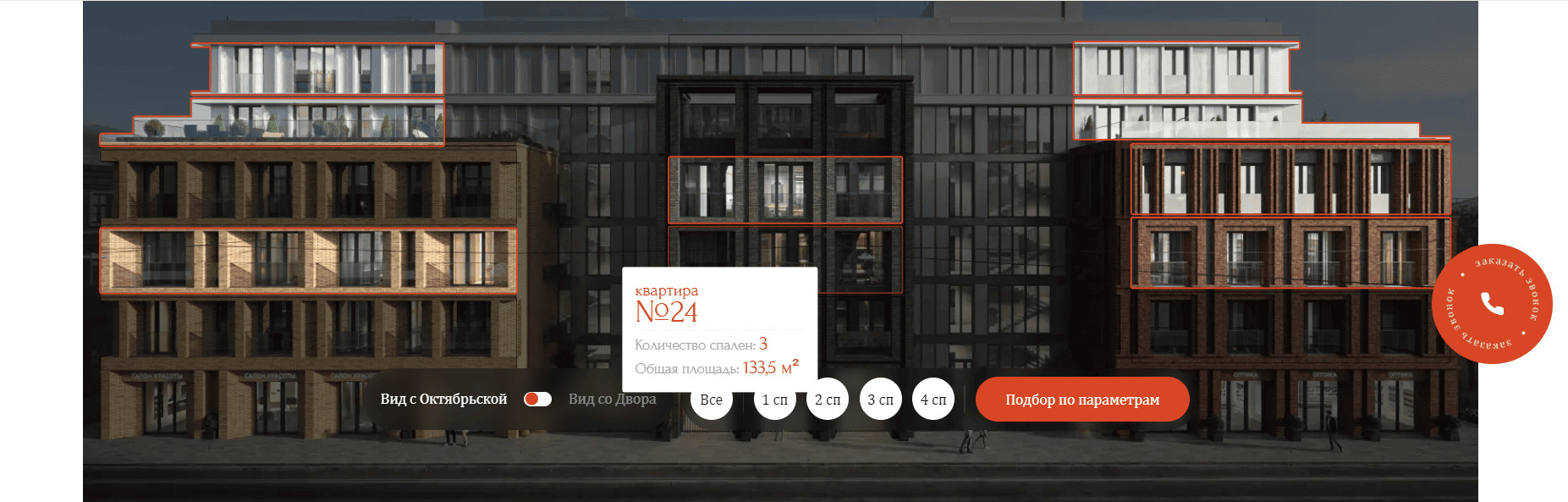 Нам показалось, что самое приятное при выборе квартиры - процесс подбора. Поэтому этот процесс мы сделали максимально удобным и наглядным! Добавили возможность выбора квартиры прямо на фасаде здания, с возможностью фильтрации по количеству комнат и переключения между сторонами дома. Такое решение позволяет без ущерба удобству сократить путь поиска, и к тому же это подчеркивает клубный формат дома. В процессе подбора, можно сразу увидеть наличие свободных квартир, варианты остекления, наличие террасы и ее размера за счет их светового выделения на генплане.