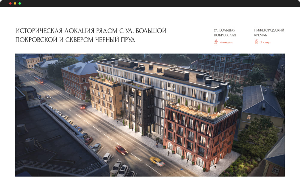 Премиум ЖК, да еще в самом центре города, возле главной пешеходной улицы Нижнего Новгорода. Такое мы не могли оставить без внимания, поэтому разработали дизайн карты, которая за счет необычной анимации погружает нас в локацию. Переключатели на карте позволяют быстро ознакомиться с интересными местами.