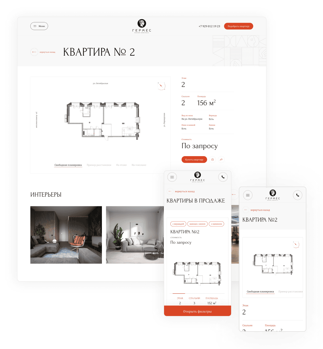 Разработали стильный и запоминающийся промо-сайт для жилого комплекса с продуманным интерфейсом, позволяющим легко ориентироваться по страницам. Также реализовали интересные дизайнерские решения, подчеркивающие премиальность и эксклюзивность дома. А несмотря на высокий ценник на квартиры ЖК Гермес, его презентация на сайте позволяет собирать достаточное количество заявок.