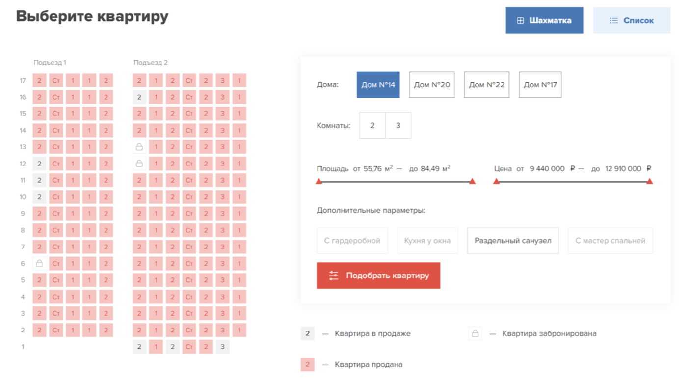 Сейчас многие застройщики предпочитают иные варианты подбора квартир: подбор на этаже или квартиры списком. И если есть альтернатива, зачем тогда оставлять шахматку?