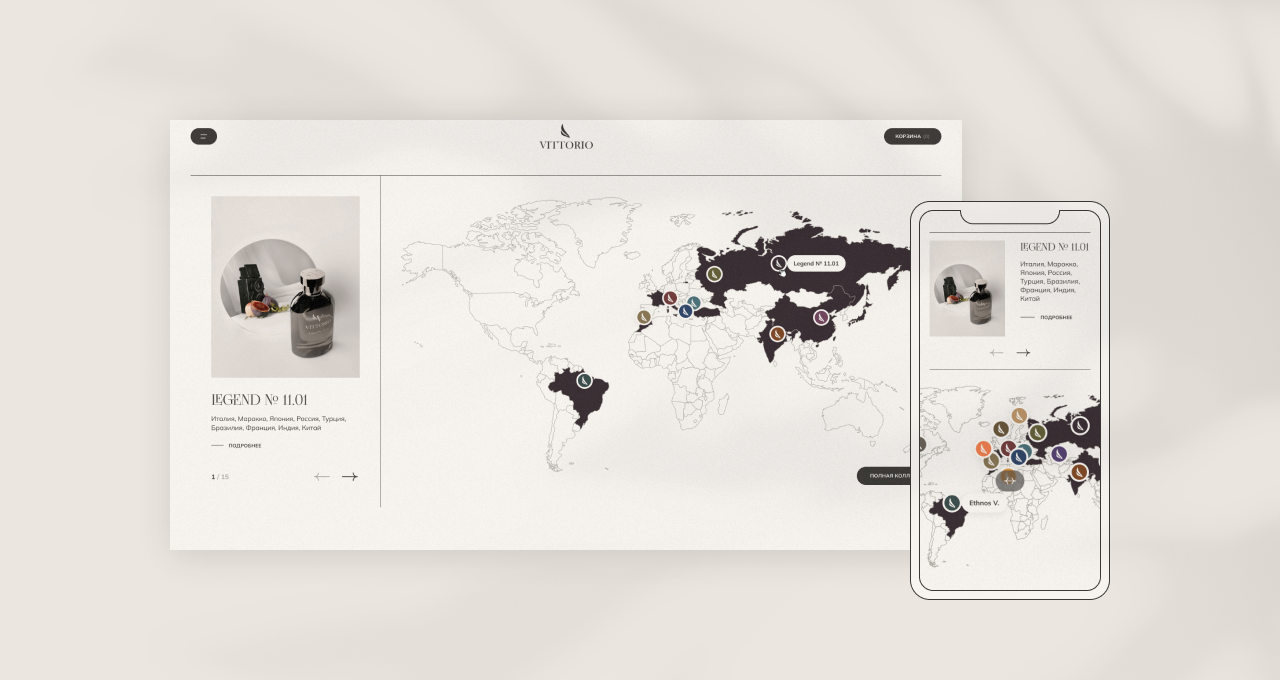 Мы сделали не просто интерактивную карту, мы превратили коллекцию Vittorio в настоящее путешествие. На карте ароматов пользователь видит, где парфюмер черпал вдохновение и ингредиенты для каждого букета. Французская лаванда, индийский сандал, сицилийский бергамот — каждая точка на карте открывает историю запаха, переносит в атмосферу страны и позволяет почувствовать её характер через экран.