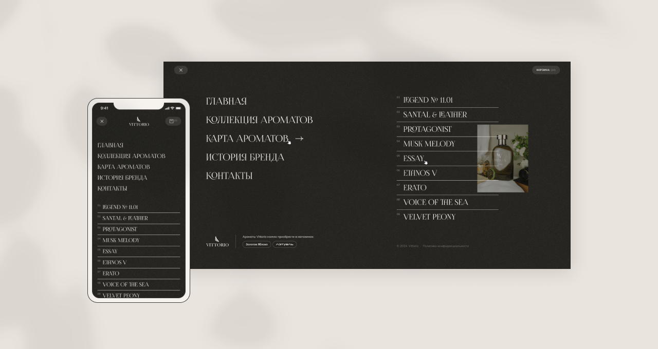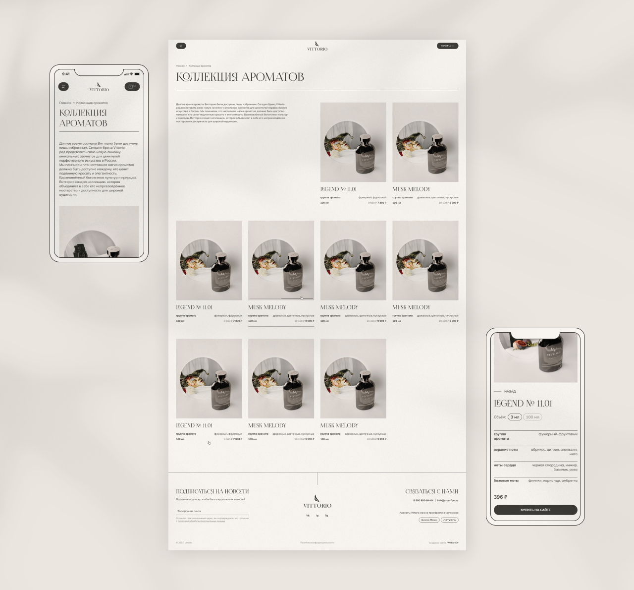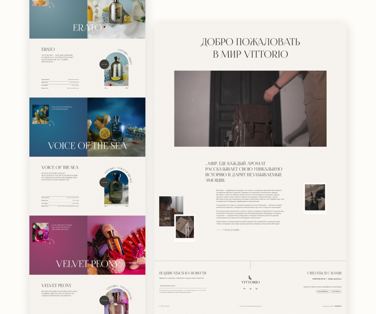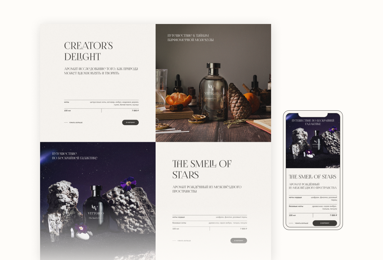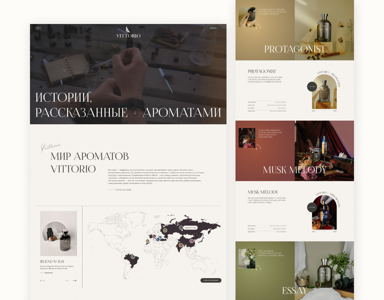 Главная страница сайта Vittorio стала не витриной, а настоящим путешествием по миру ароматов. Мы подошли к задаче так, словно создаём не интернет-магазин, а выставку произведений искусства. Каждый аромат подан как отдельная глава истории — со своей визуальной атмосферой, текстовым сопровождением и цветовой драматургией.
