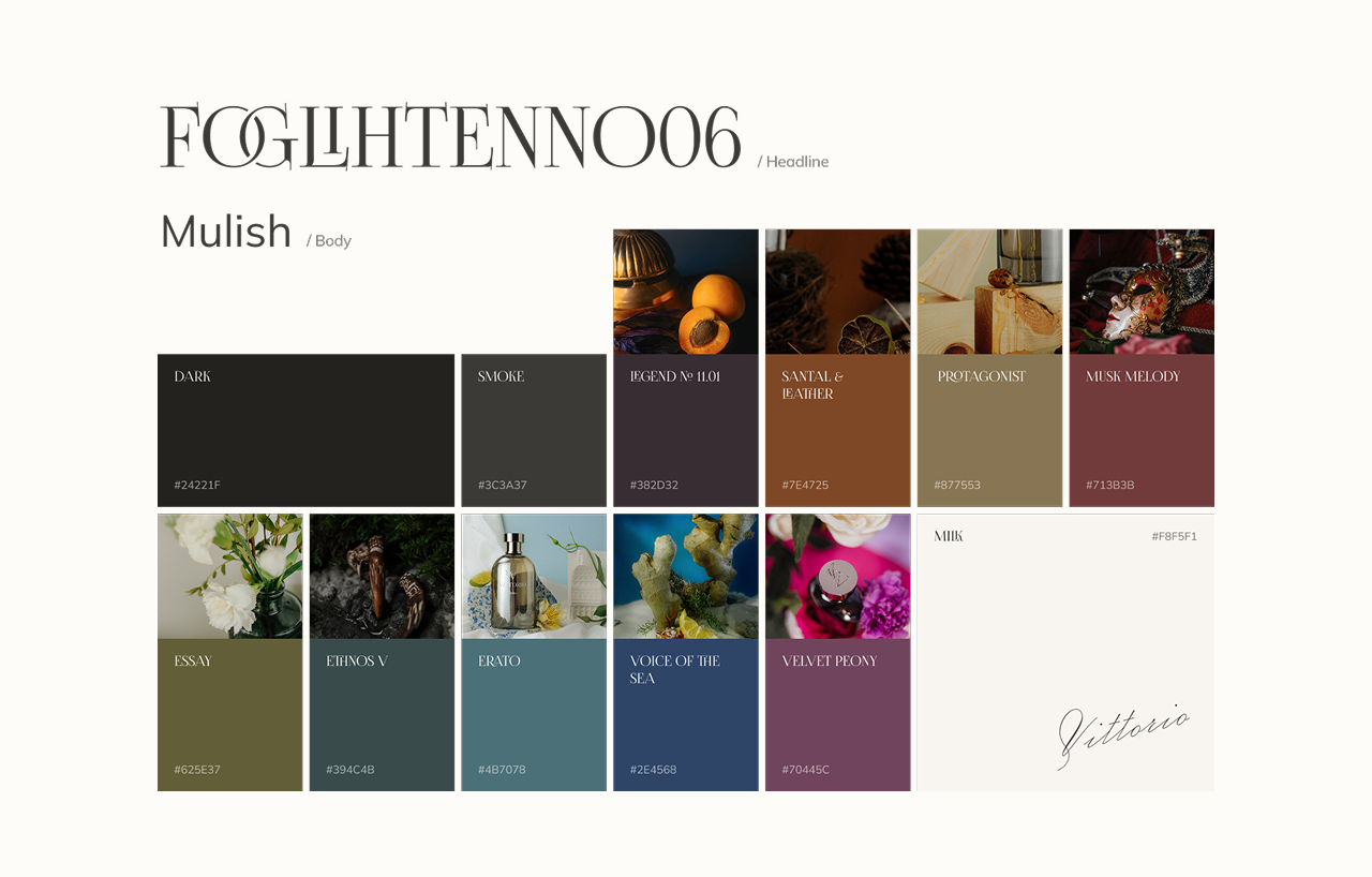Для Vittorio мы предложили приглушённую цветовую гамму, основанную на природных, благородных оттенках. Мягкие градиенты создают плавные переходы между блоками и перекликаются с настроением ароматов. Каждый экран ощущается как отдельная история, но при этом сохраняет визуальное единство бренда. Важно было подчеркнуть происхождение Vittorio и при этом избежать излишней «официальности» — палитра работает на эмоцию, а не на холодную строгость.