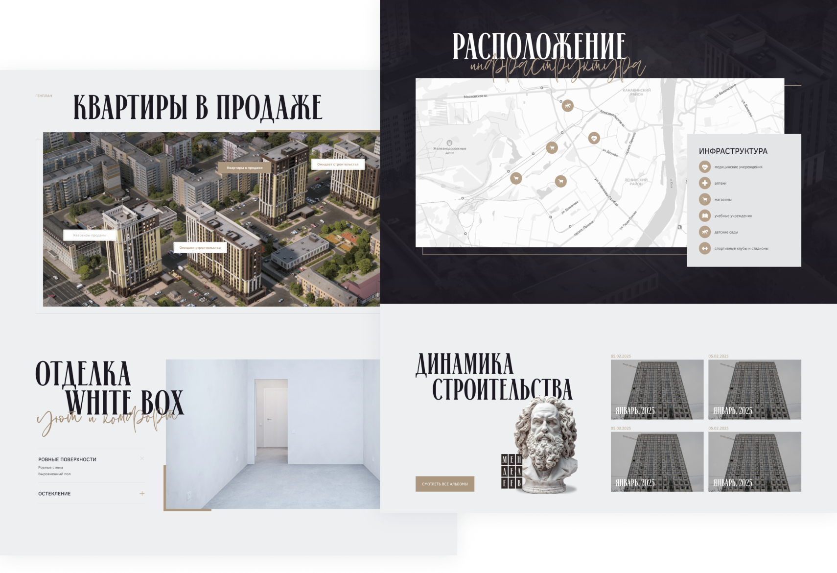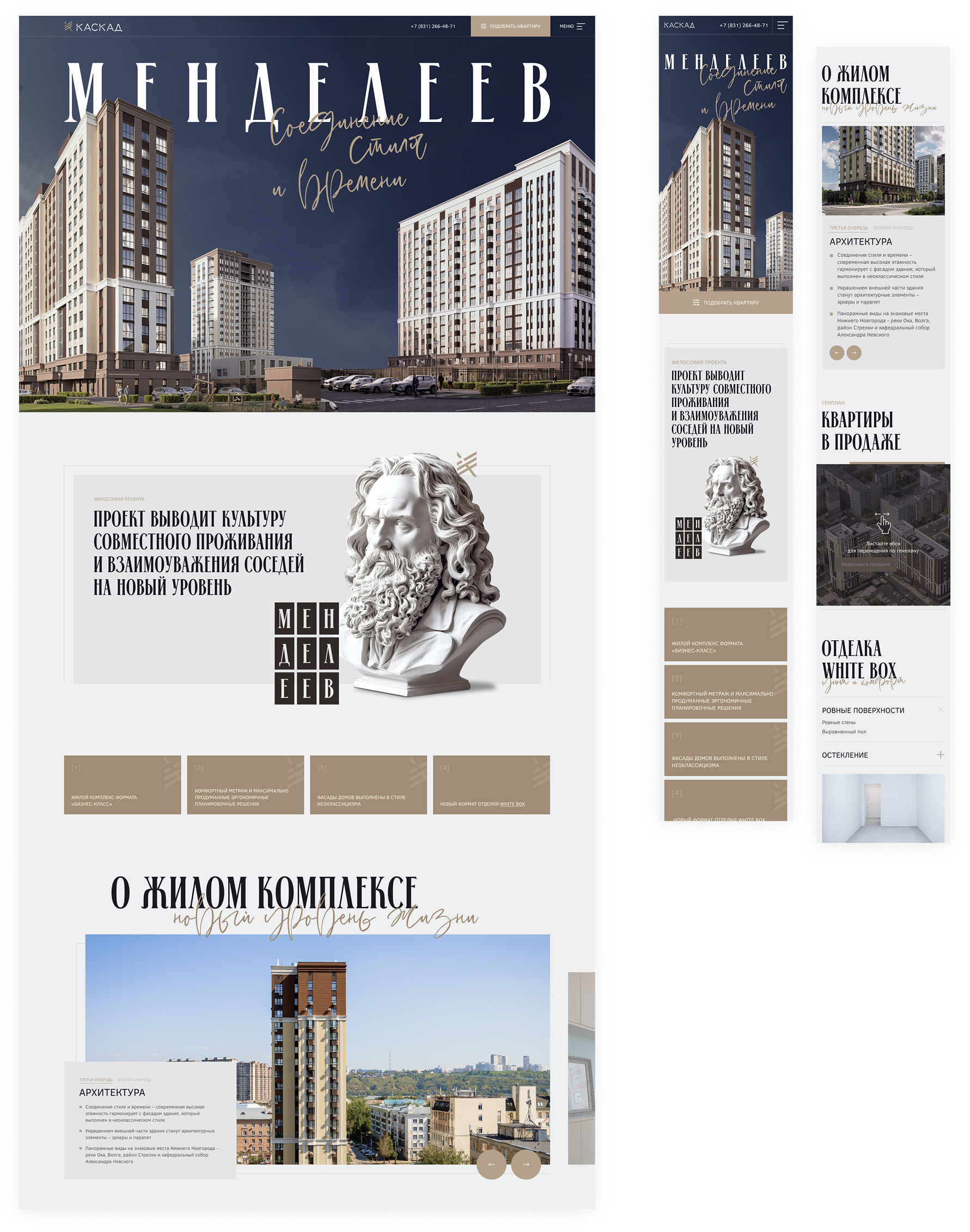 В основе визуального решения сайта — обновленный фирменный стиль, предоставленный заказчиком. Архитектура жилого комплекса выдержана в сдержанной классической эстетике, и ключевой идеей проекта стало соединение современного стиля и классического, проверенного временем.
