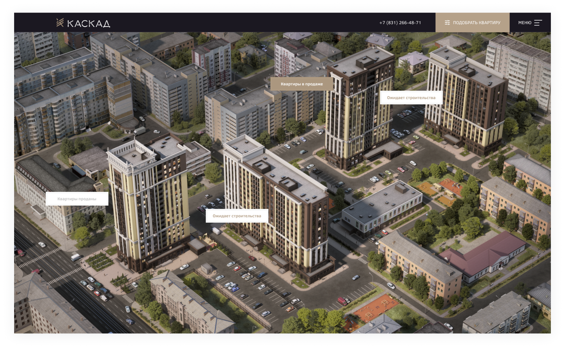Реализовали интерактивную схему жилого комплекса, где можно посмотреть, на каком этапе строительства находится каждый дом и перейти к подбору квартир