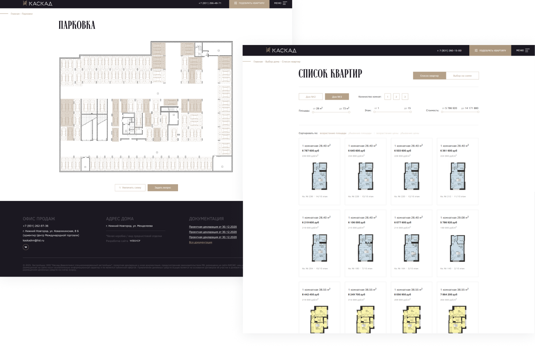Проработали удобную систему фильтрации квартир по основным параметрам. Также реализовали интерактивные схемы парковок и кладовых.