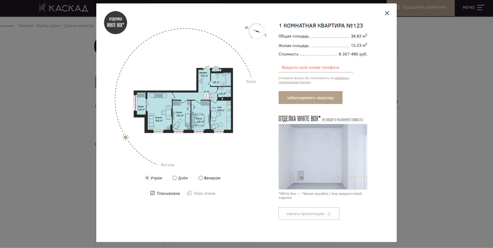 Карточка квартиры содержит основную информацию о характеристиках выбранной квартиры. Пользователь может переключаться между вариантами планировок, и также с помощью интерактивной схемы посмотреть положение солнца, относительно окон квартиры.