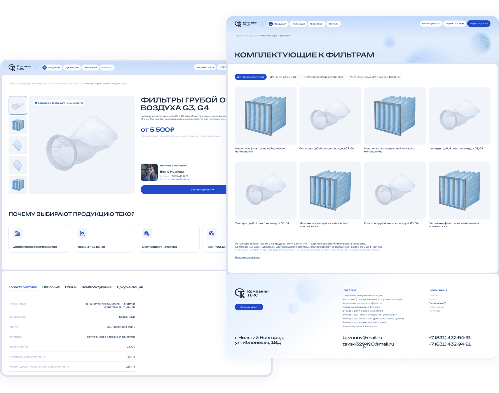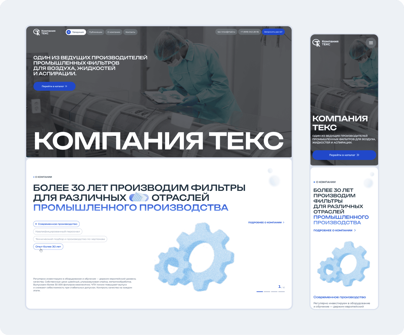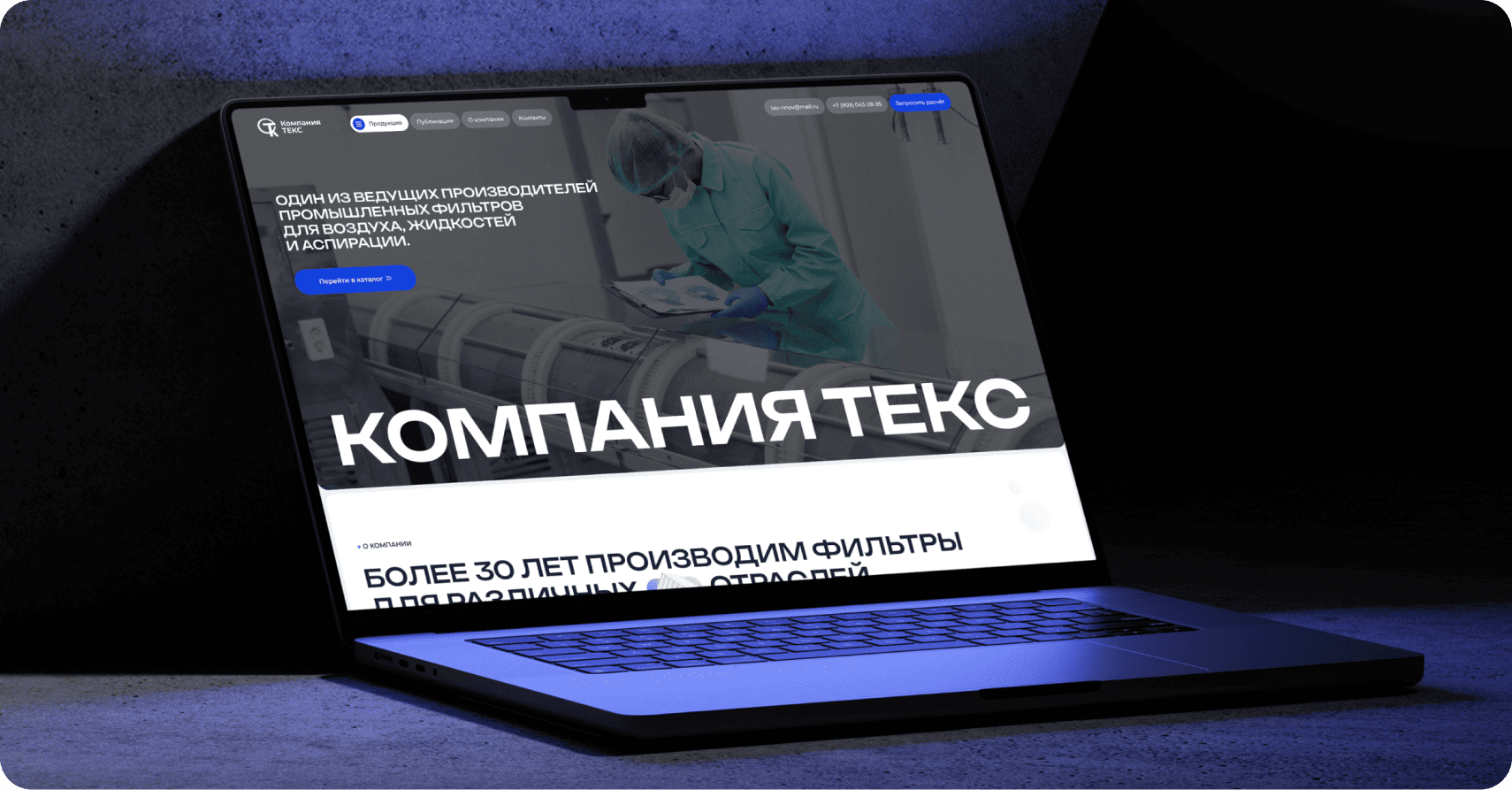 Компания ТЕКС — это крупный производитель промышленных фильтры для очистки воздуха. Перед нами стояла задача разработать современный корпоративный сайт с каталогом продукции, который сочетал бы современный и эстетичный дизайн с функциональностью, ориентированной на B2B-аудиторию.