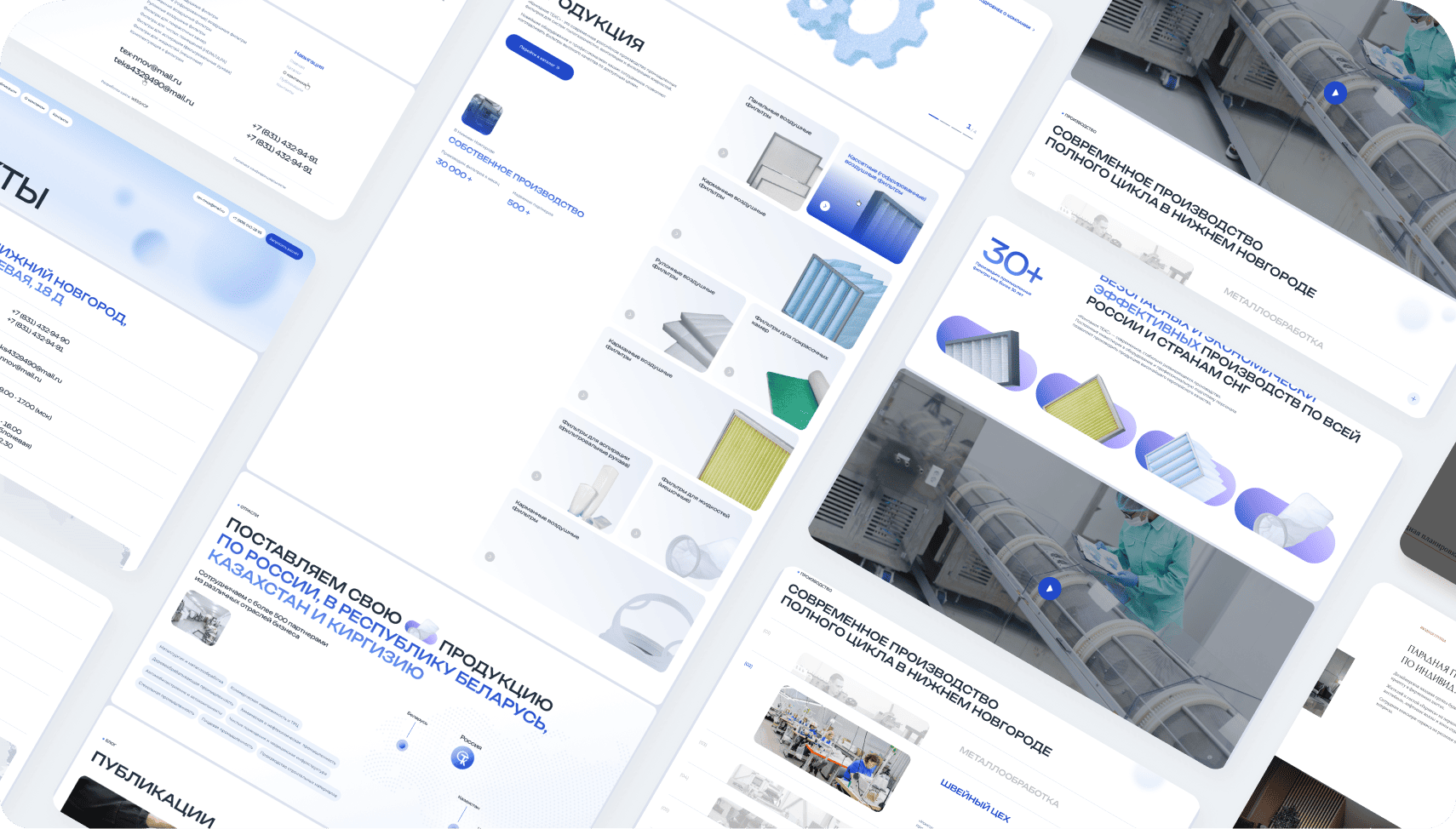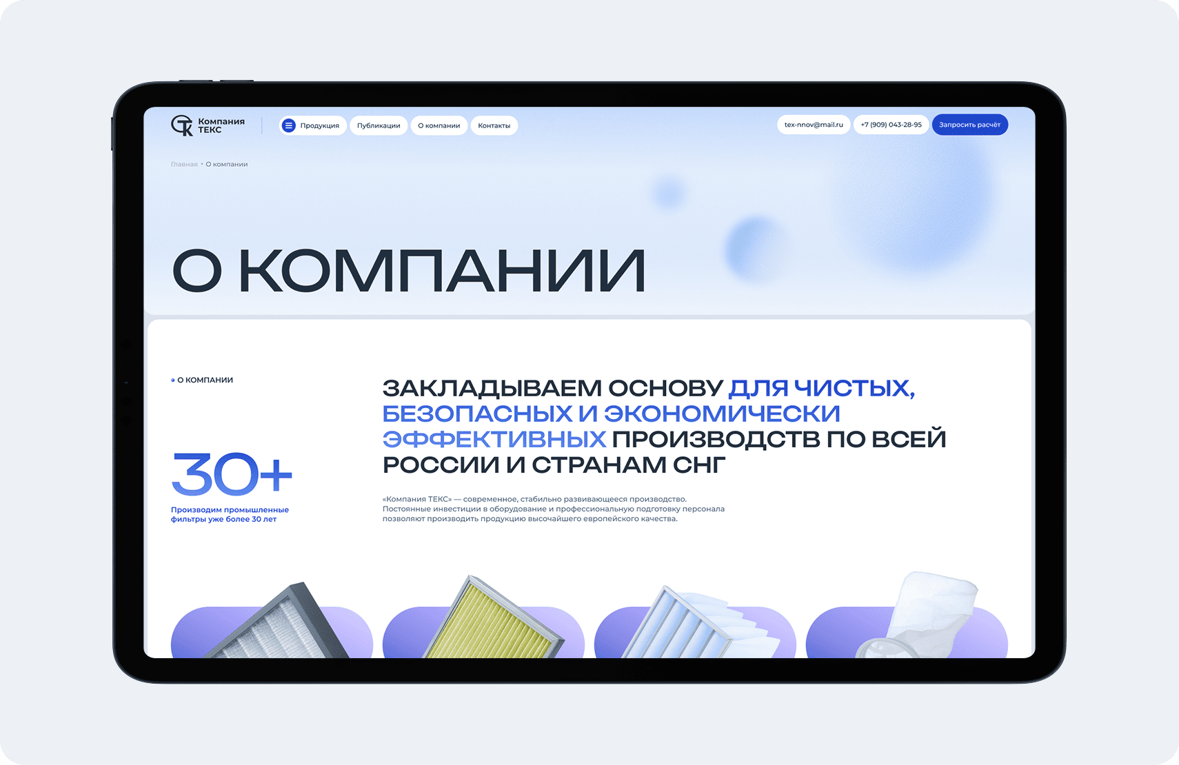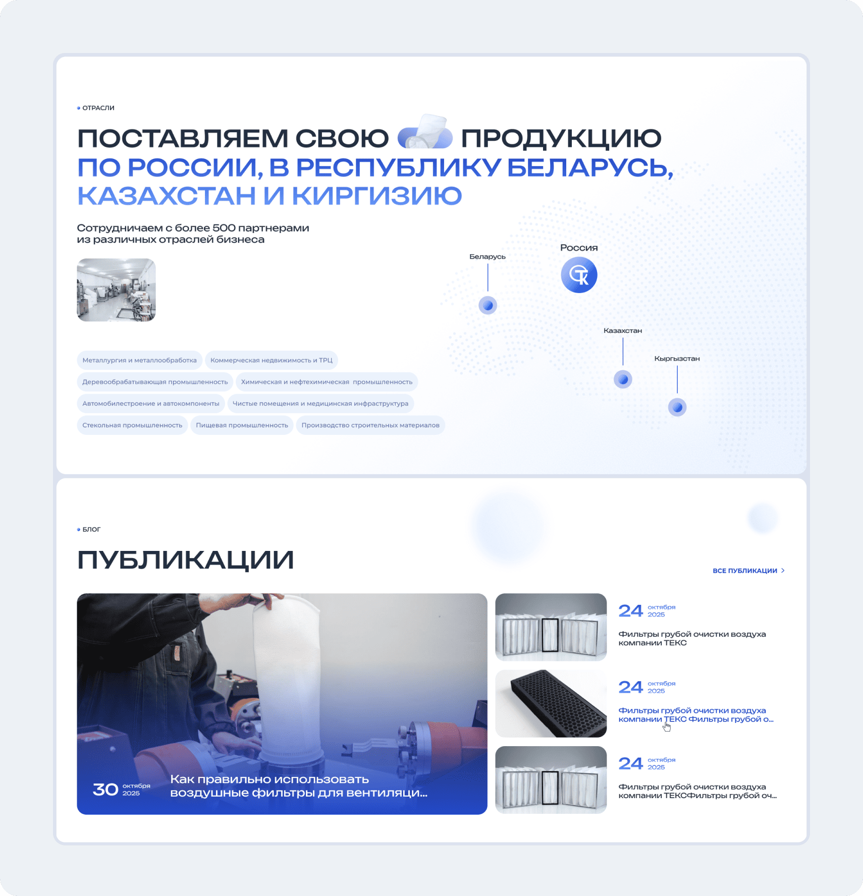 Компания ТЕКС — это крупный производитель промышленных фильтры для очистки воздуха. Перед нами стояла задача разработать современный корпоративный сайт с каталогом продукции, который сочетал бы современный и эстетичный дизайн с функциональностью, ориентированной на B2B-аудиторию.