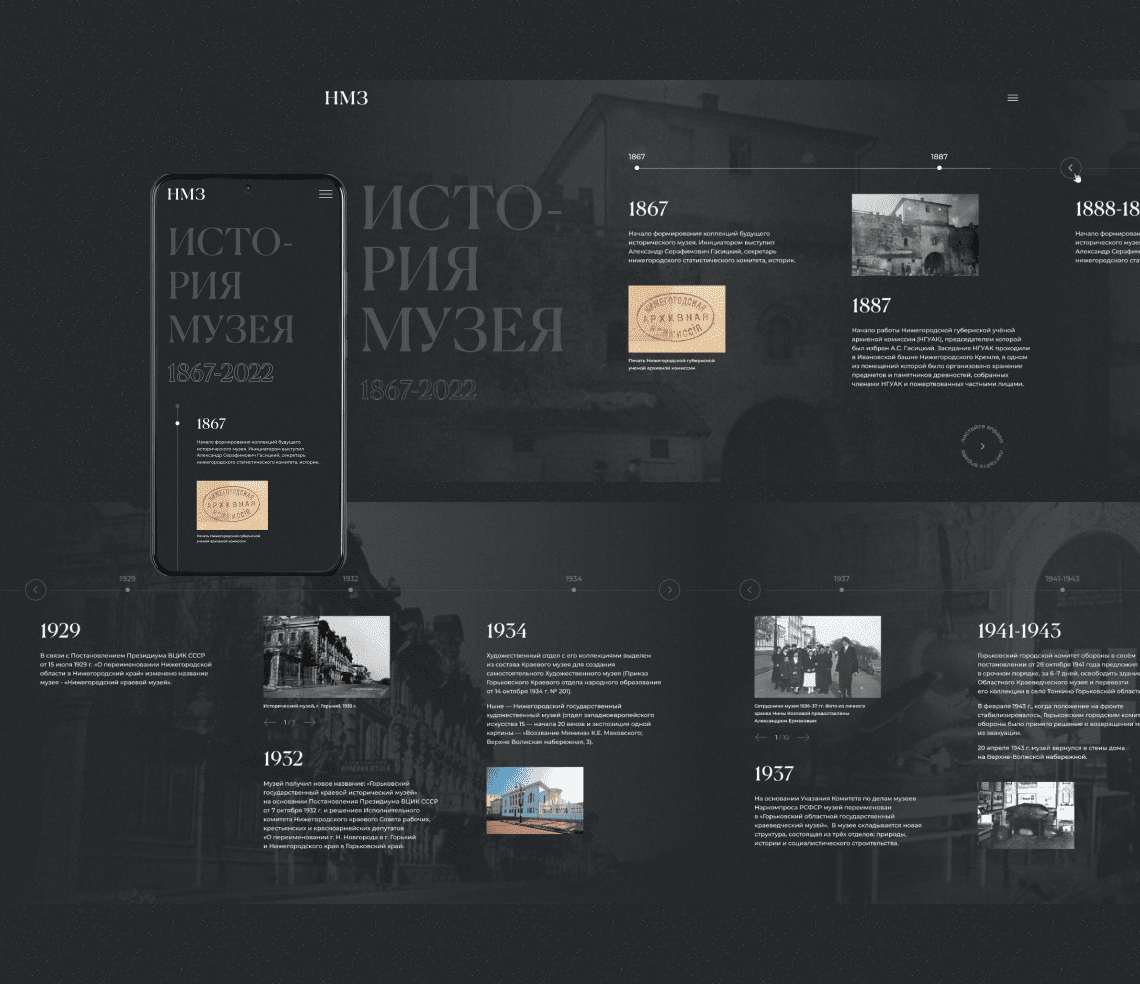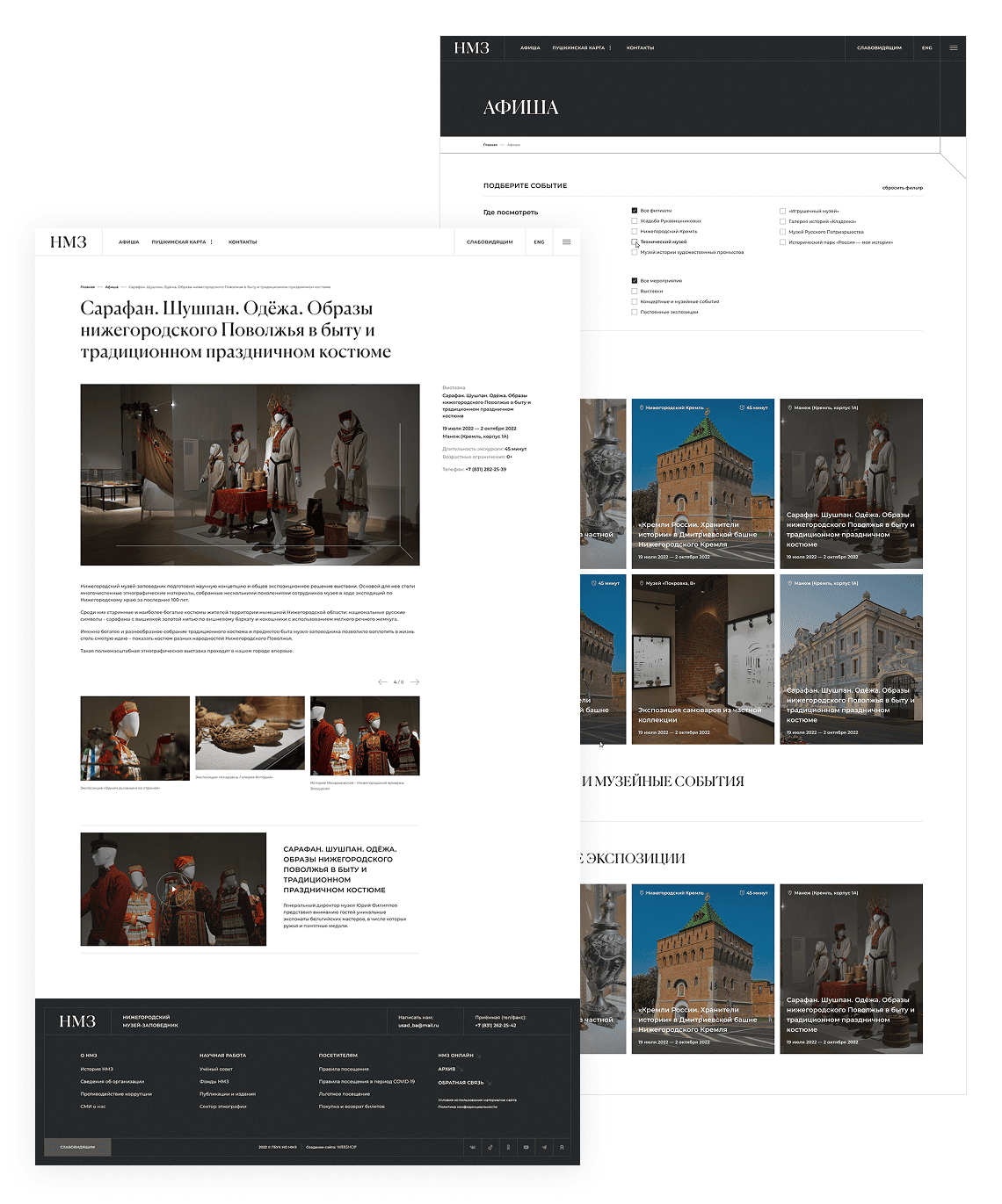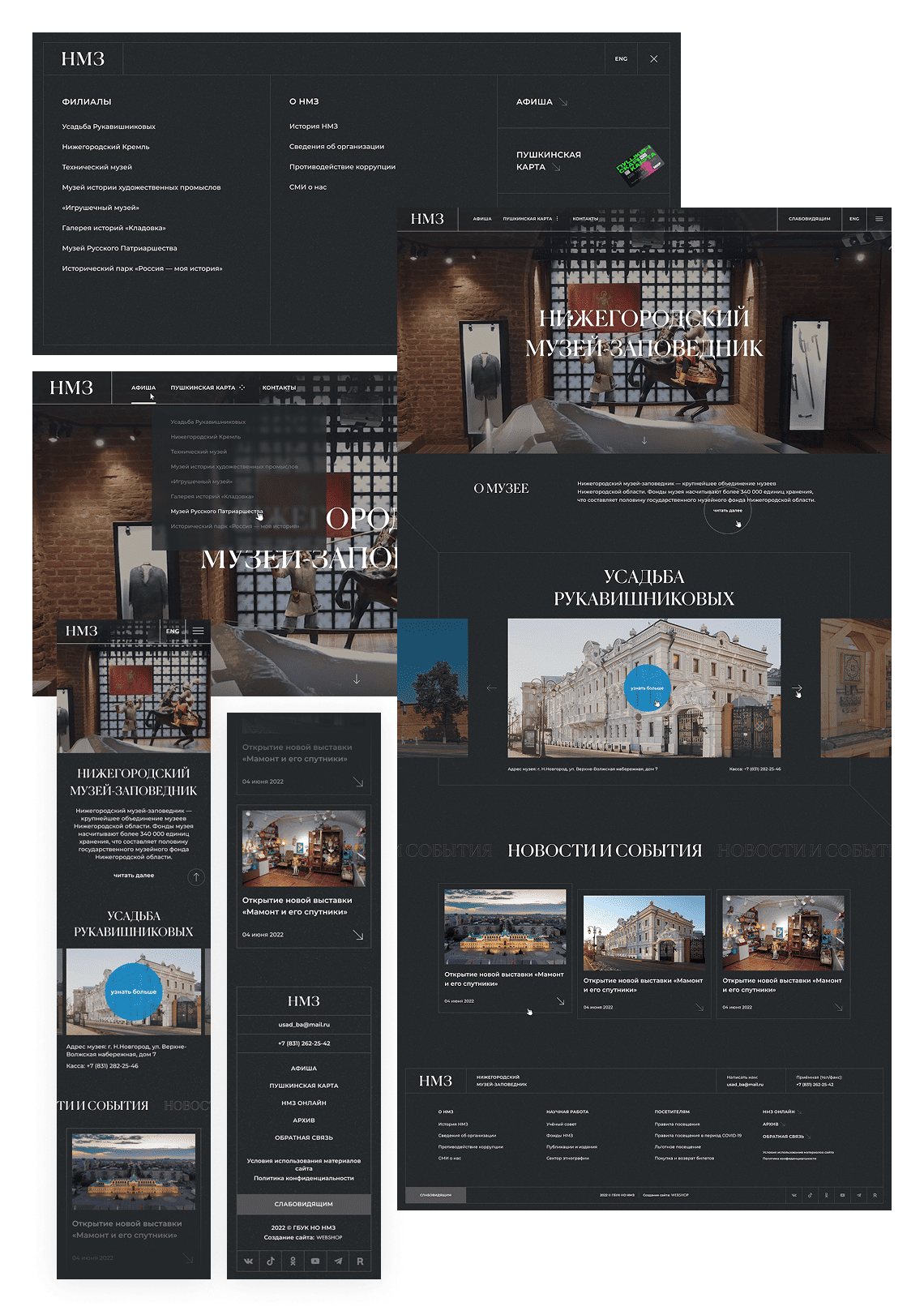 НМЗ объединяет в себе несколько известных музеев Нижегородской области. Каждый из них обладает своей историей, проводит свои мероприятия и обозначается своим фирменным цветом. Важно было объединить все филиалы на сайте так, чтобы прослеживалась единая стилистика.