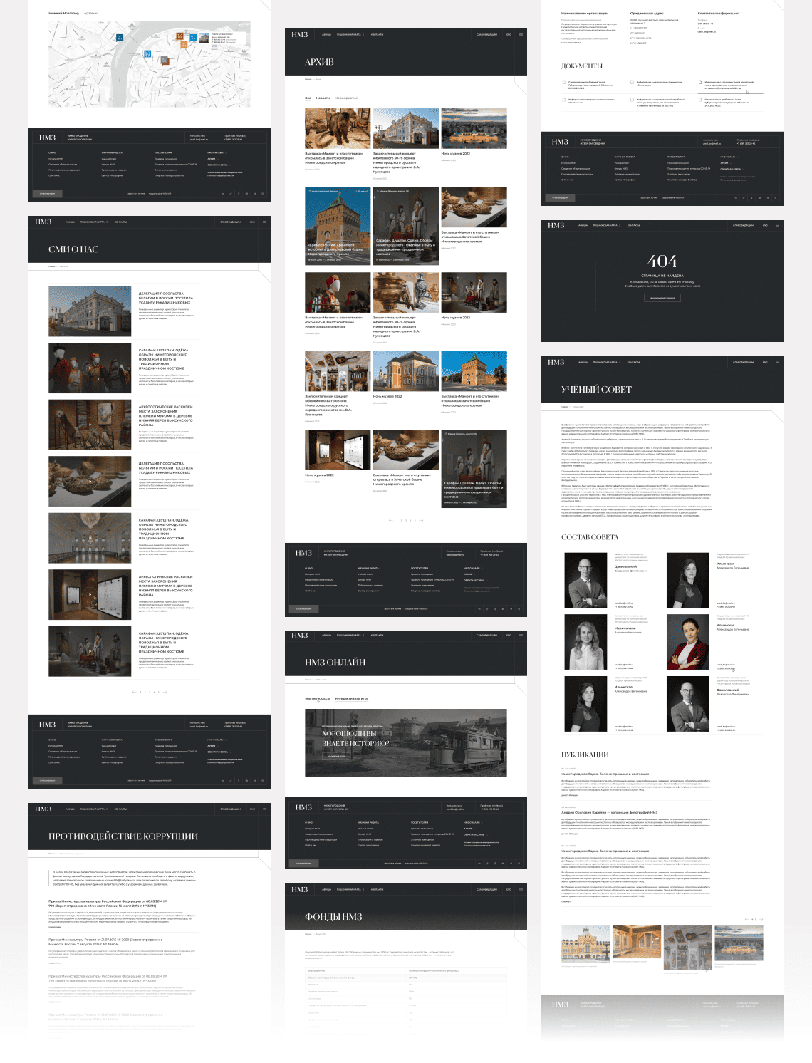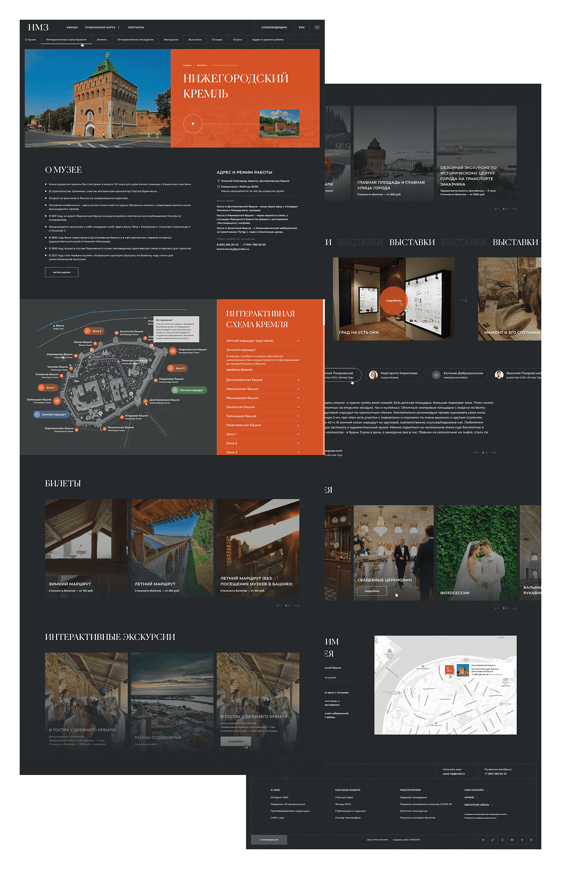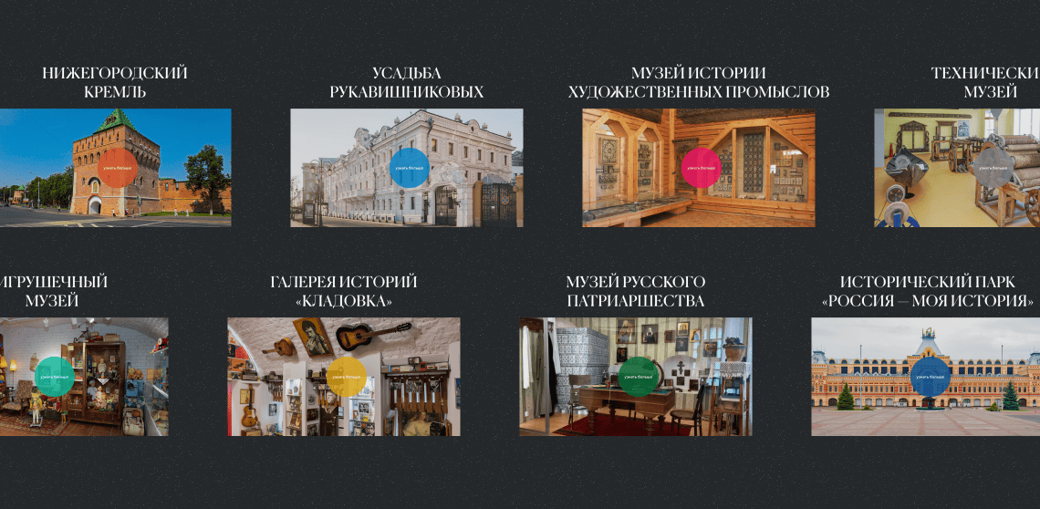 НМЗ объединяет в себе несколько известных музеев Нижегородской области. Каждый из них обладает своей историей, проводит свои мероприятия и обозначается своим фирменным цветом. Важно было объединить все филиалы на сайте так, чтобы прослеживалась единая стилистика.