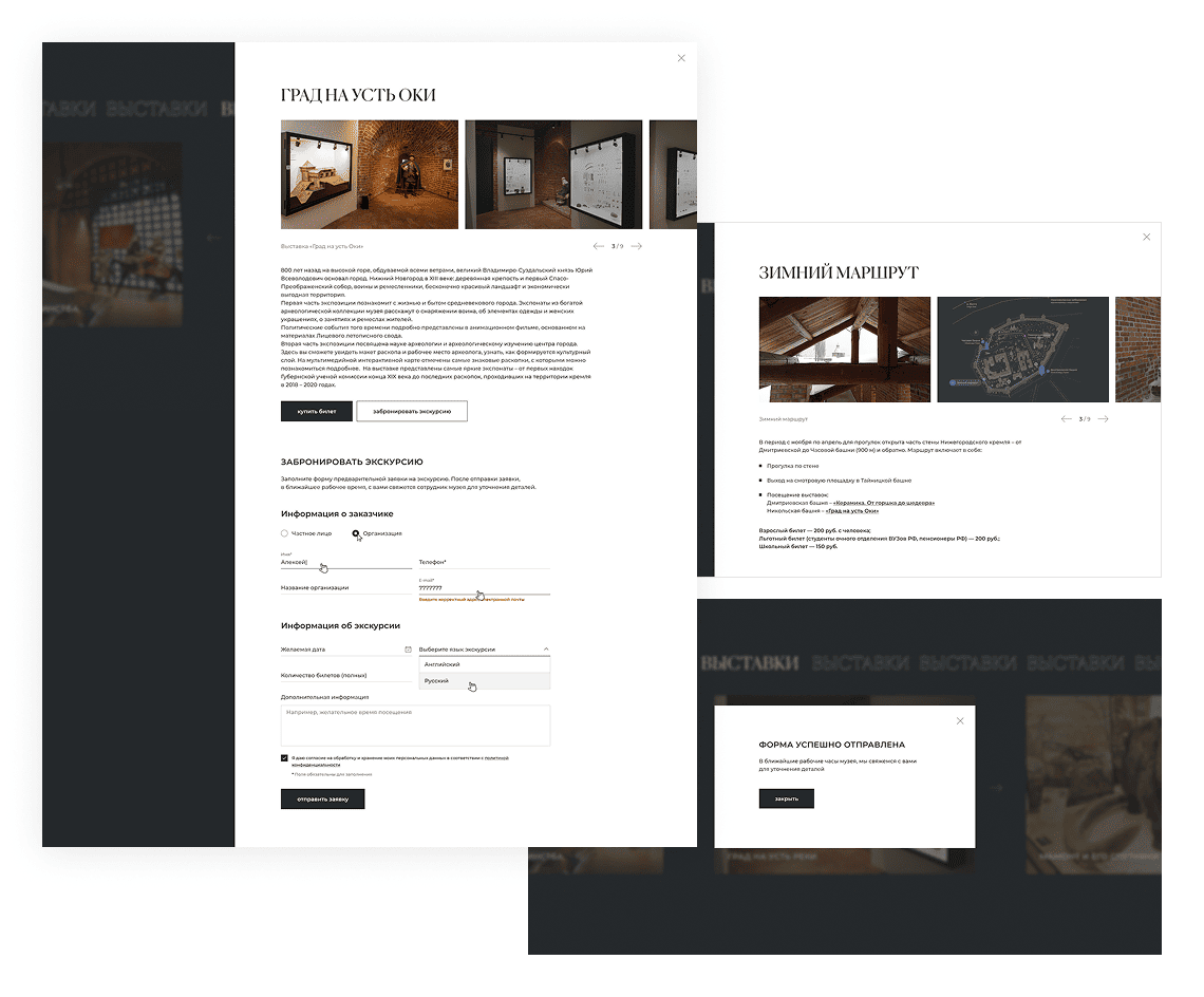 Нижегородский Музей-Заповедник богат на различные события, происходящие в разных филиалах. Для отображения всех мероприятий на одной странице,мы создали отдельный раздел «Афиша».