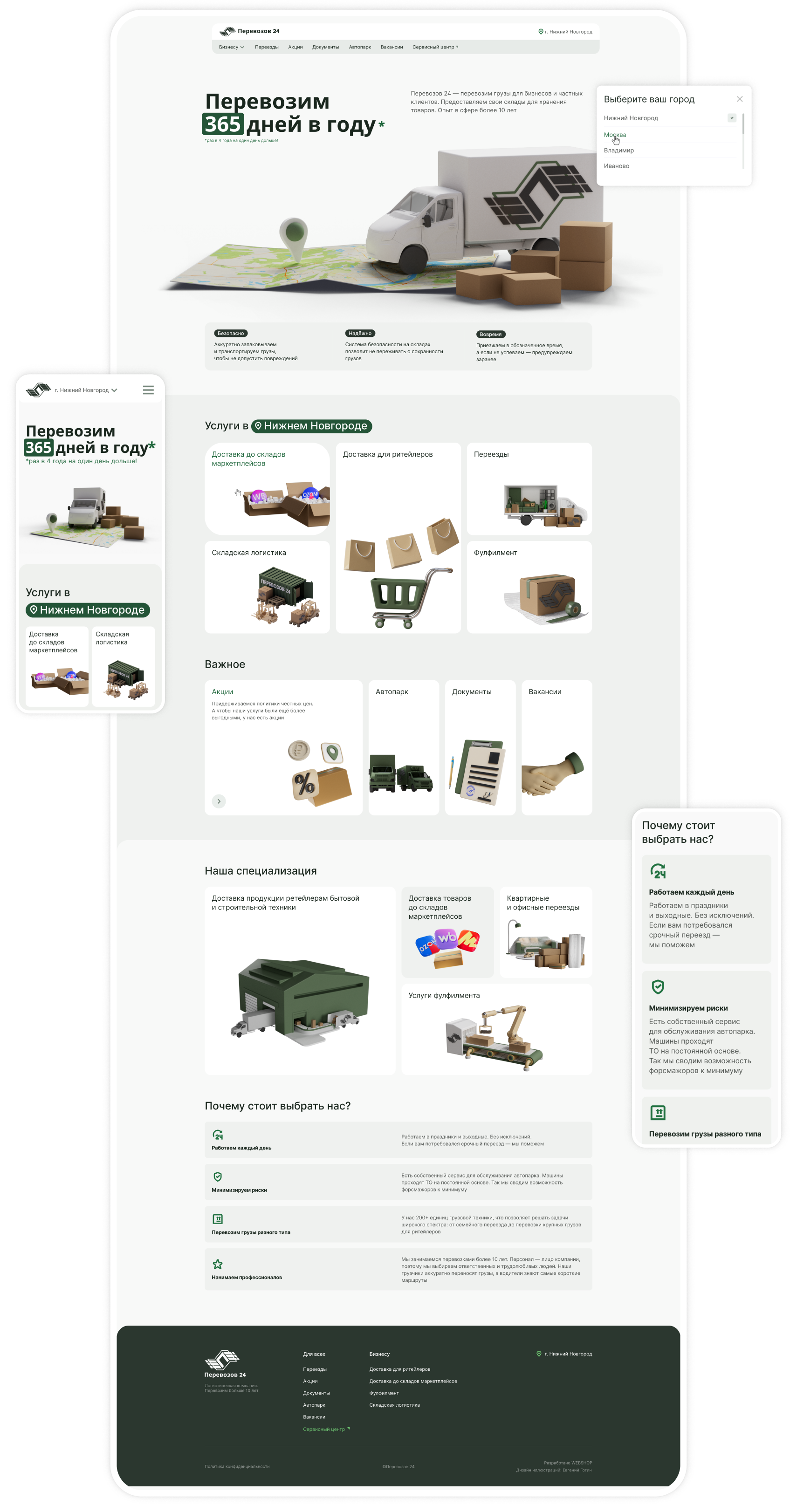 На главной странице можно выбрать город, в котором находится пользователь. В зависимости от выбора, меняется список услуг. Сделать выбор можно как в шапке, так и в самом блоке с услугами