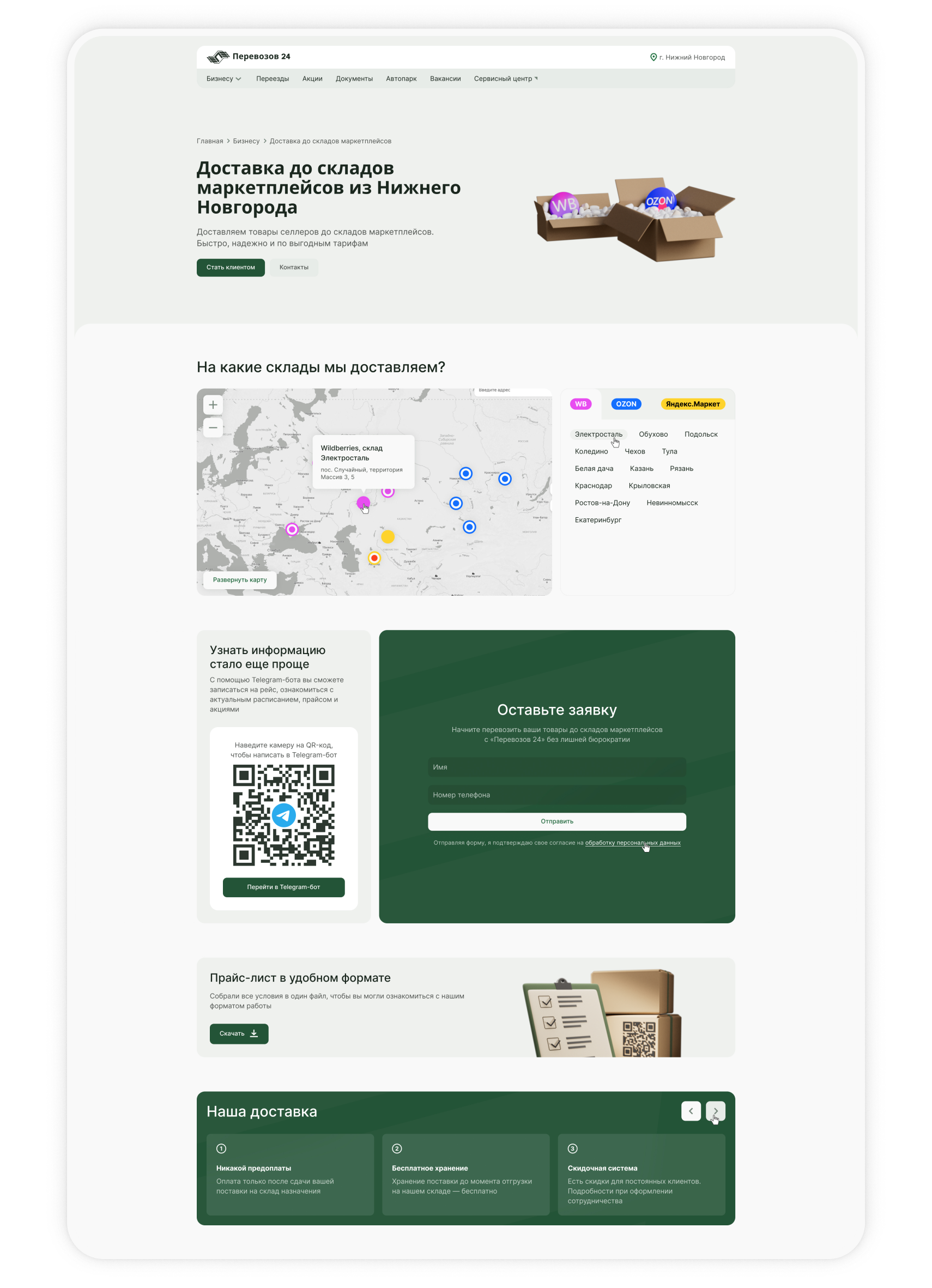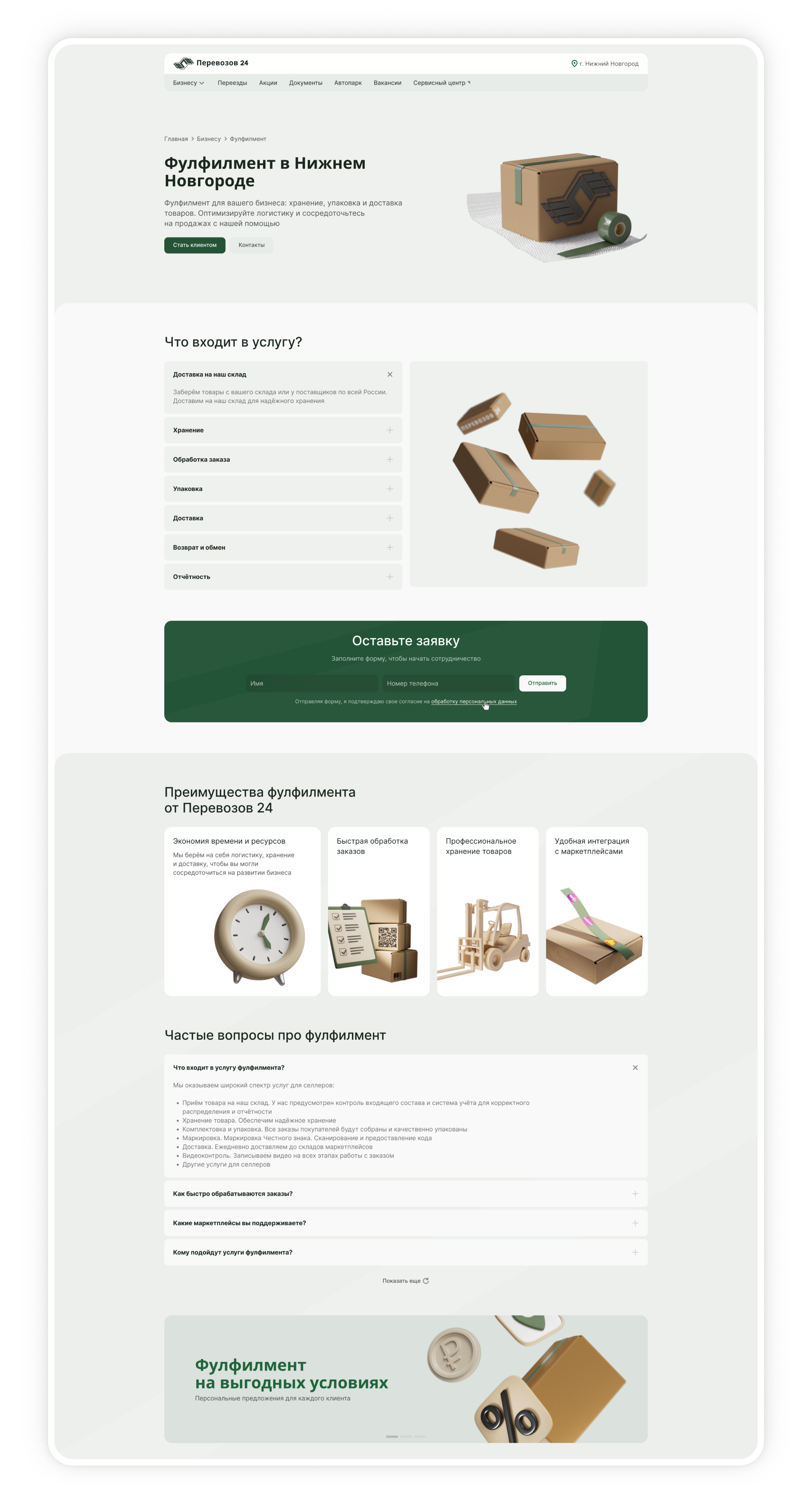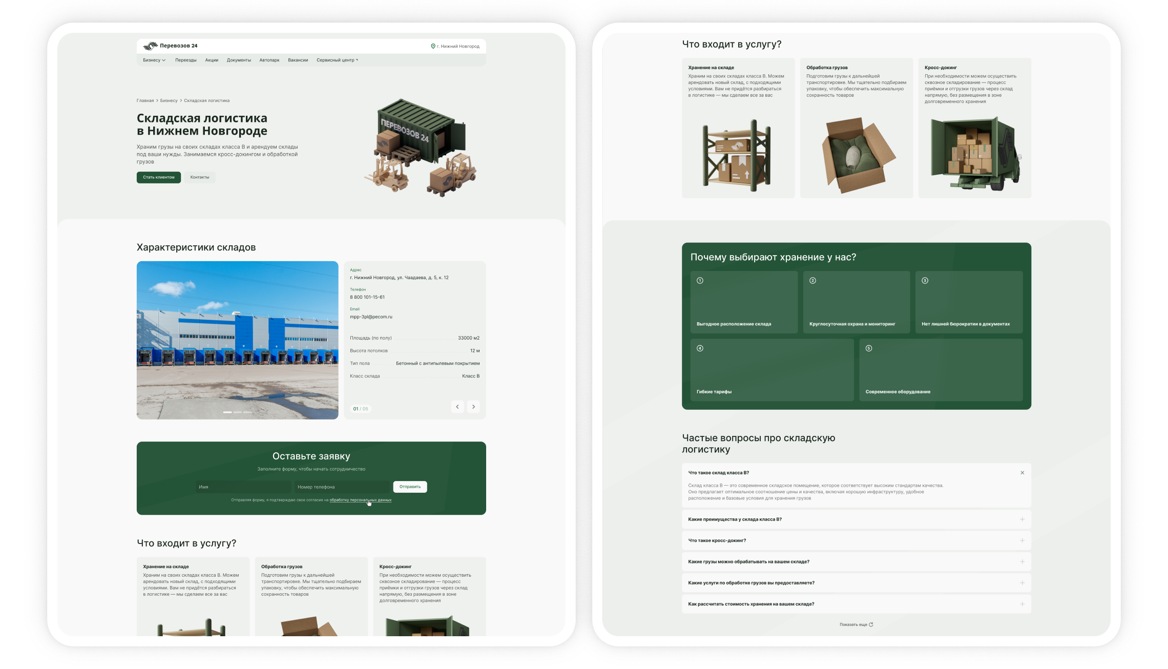Для страницы «Складская логистика» сделали слайдер доступных складов с подробными характеристиками и фото складов. Описали что входит в услугу и добавили блок «Вопрос-ответ»