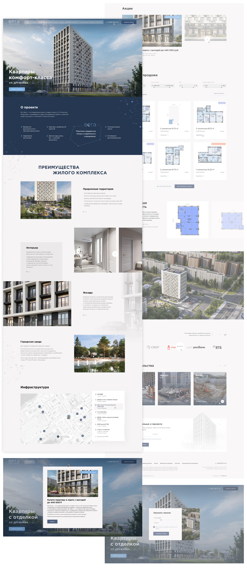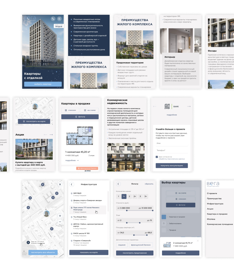 - Разработана удобная система подбора квартир с адаптивной системой фильтрации;