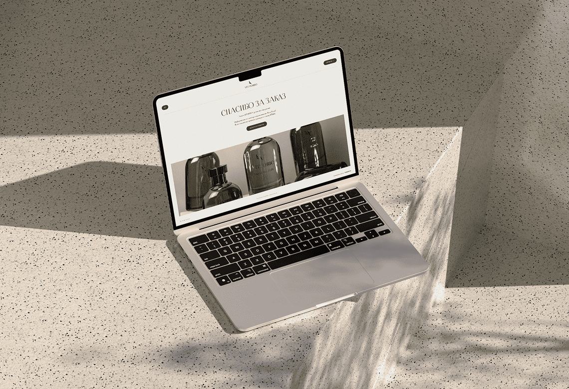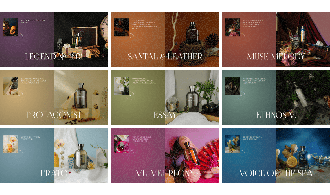 Главная страница сайта представляет собой путешествие в мир ароматов, где каждый из них раскрывается как произведение искусства — с уникальной визуальной историей, текстовым описанием и тщательно подобранной цветовой атмосферой. При разработке важно было передать характер нишевой парфюмерии: элегантность и минимализм в сочетании с натуральными оттенками и текстурами.