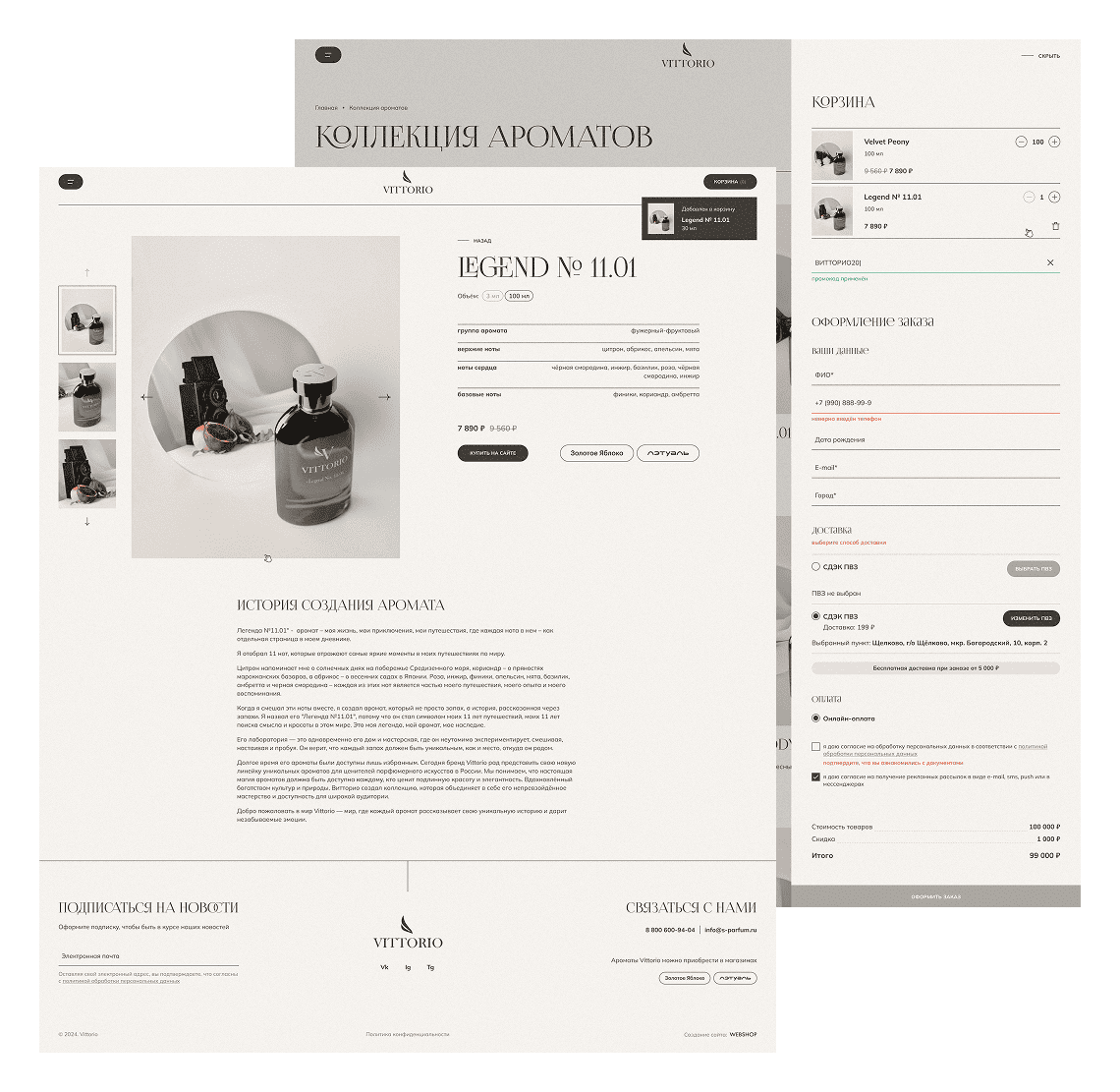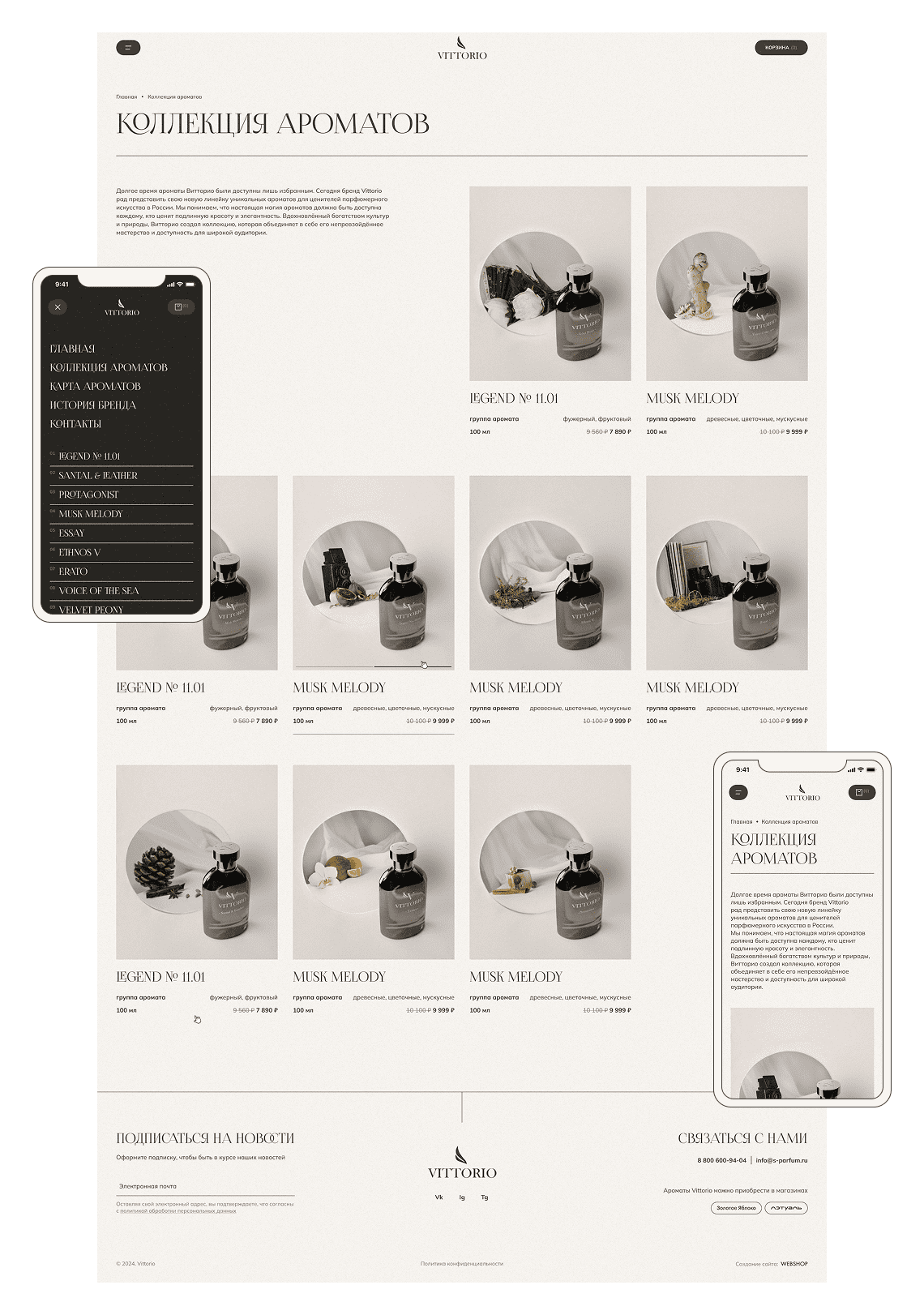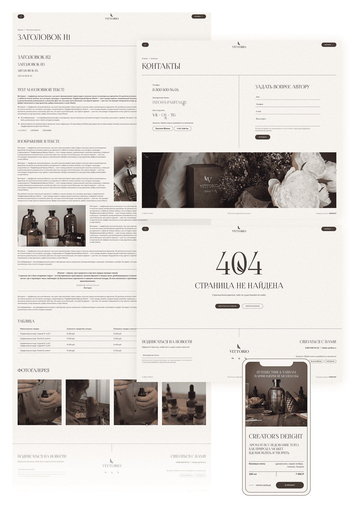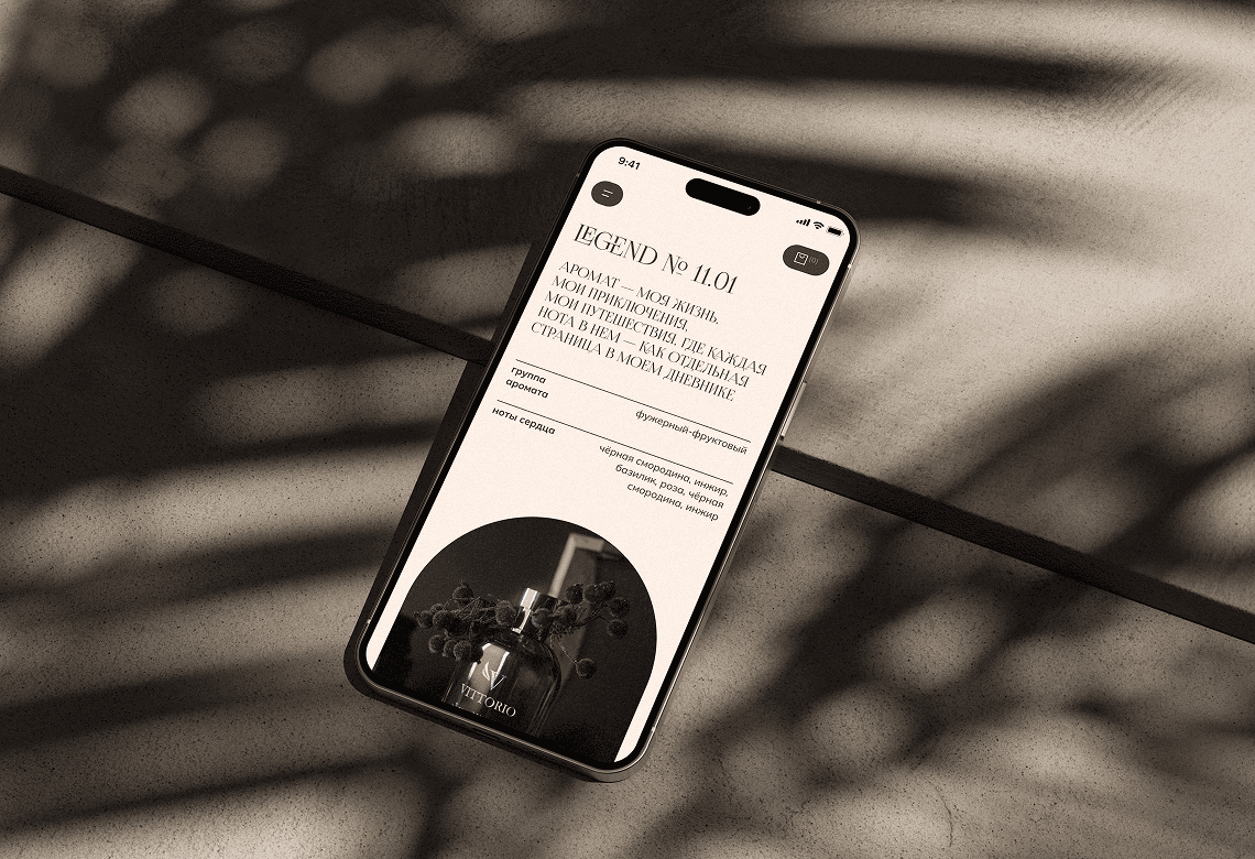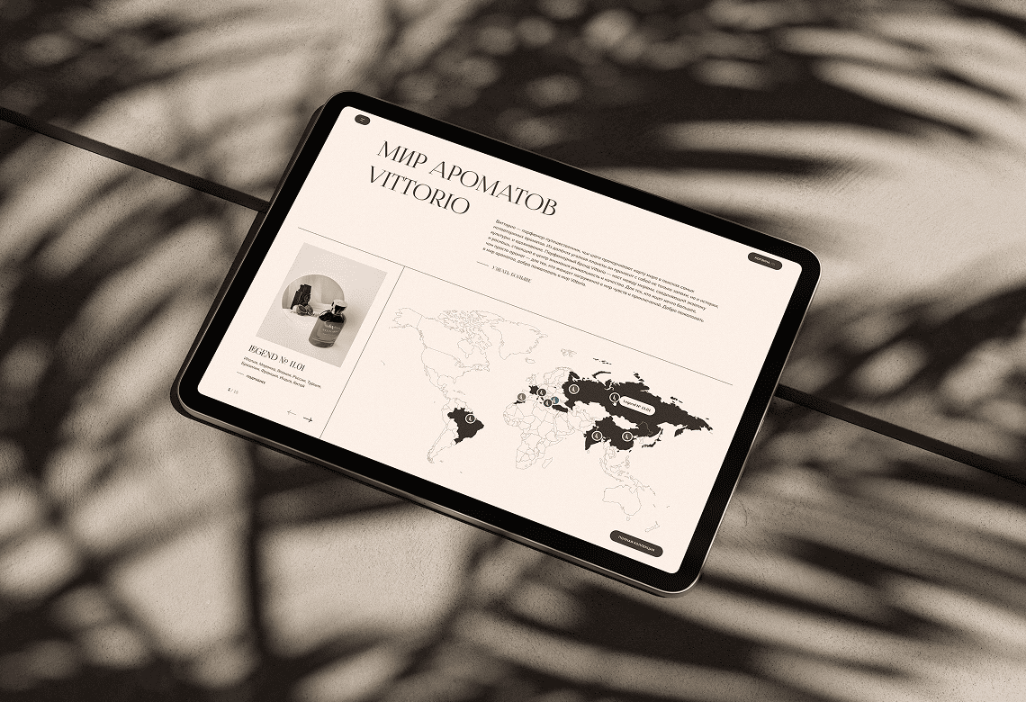 Приглушённая благородная палитра с мягкими градиентами отражает настроение ароматов Vittorio и подчёркивает происхождение бренда. Изящные заголовки задают тон бренда, а шрифт основного текста без засечек обеспечивает комфортное чтение даже больших объёмов текста.