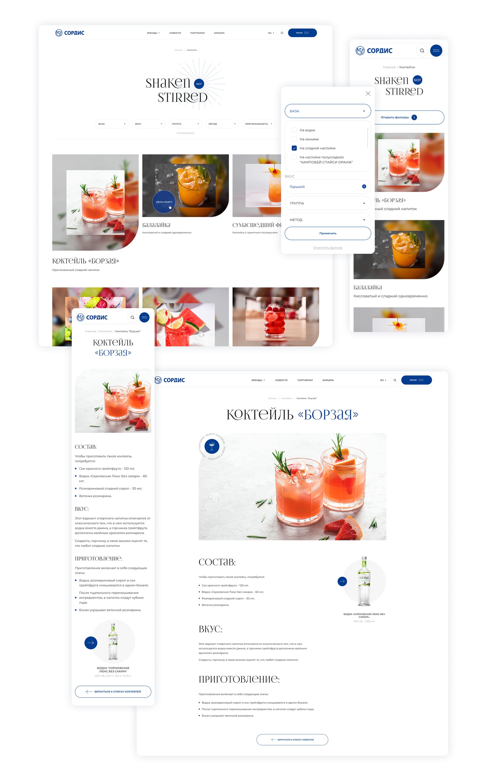 Для привлечения большей аудитории на сайт добавили страницу с рецептами коктейлей. Каждый быстро найдёт рецепт по душе с помощью фильтров: можно выбрать основу коктейля и другие параметры