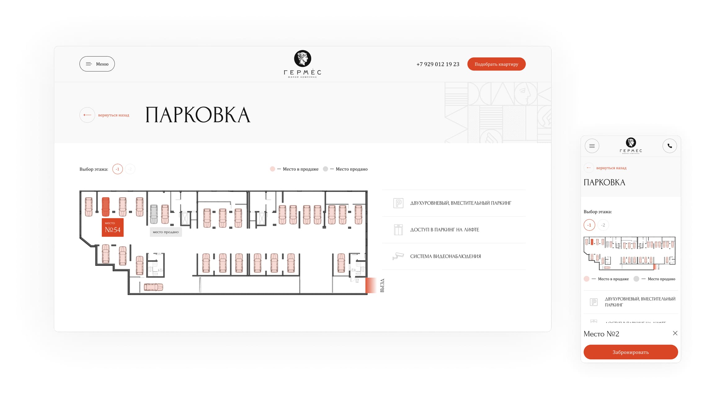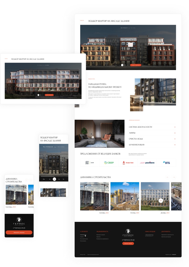 - Реализована адаптивная верстка с интерактивным подбором квартир и машиномест;